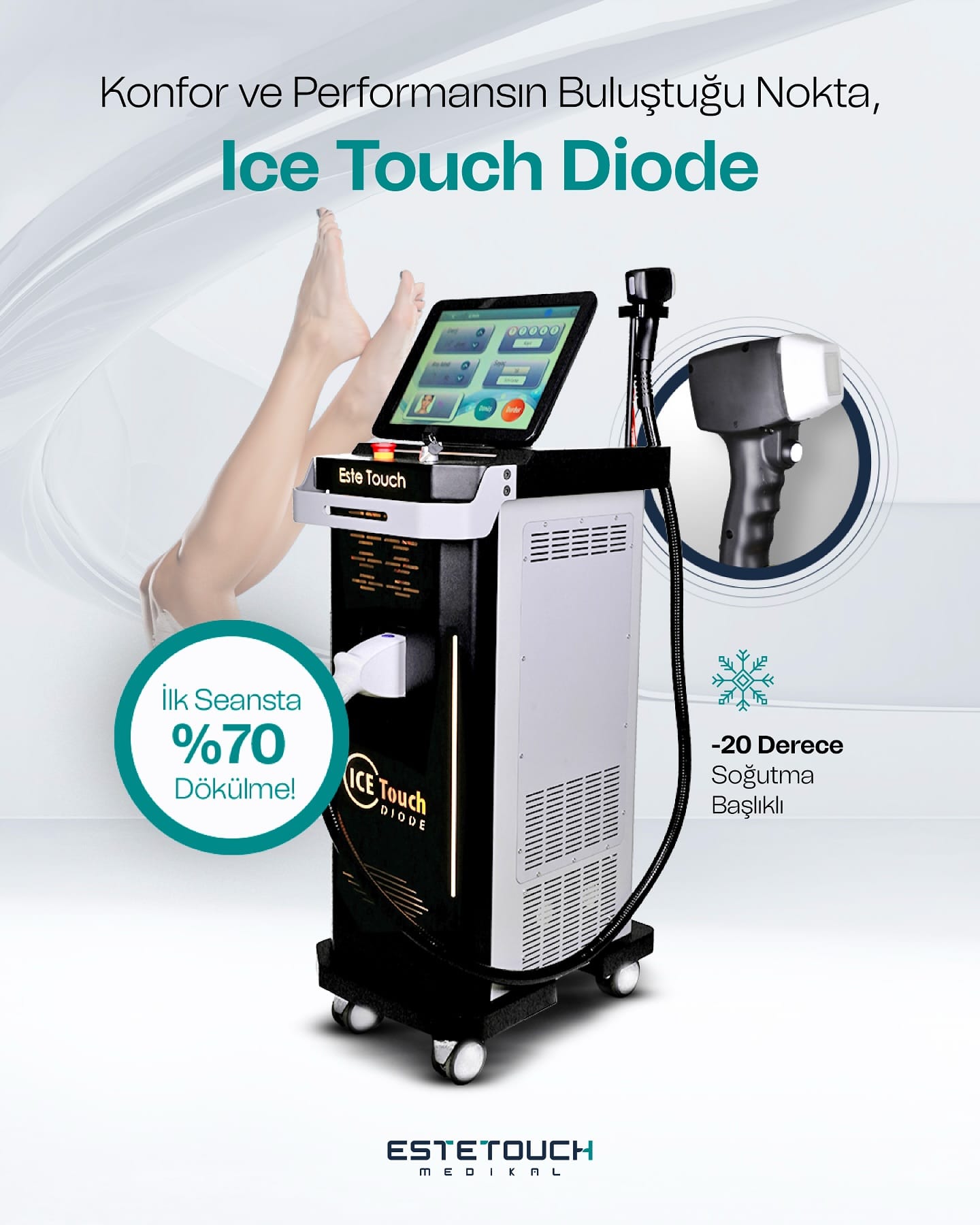 ICE TOUCH DIODE LASER, one of the new-generation laser hair removal devices from the EsteTouch family, is a Diode Laser Hair Removal device that provides permanent hair removal with 810 nm Gold Standard wavelength laser beams.